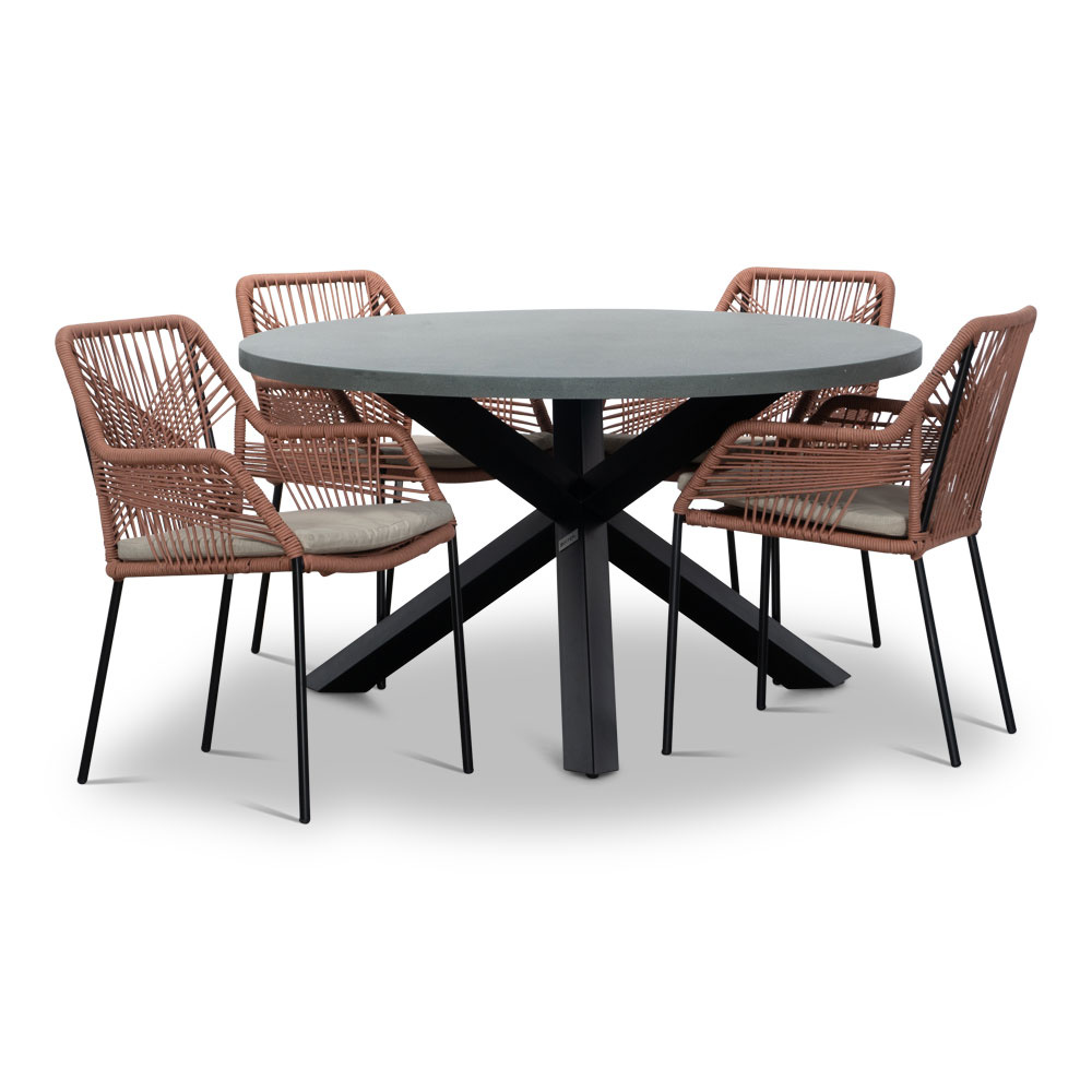 De Meran/Seville terra dining tuinset 5-delig | betonlook + touw | 135cm rond is een schitterende tuinset geschikt voor 4 personen. De tuinset komt uit de collectie van BUITEN living.